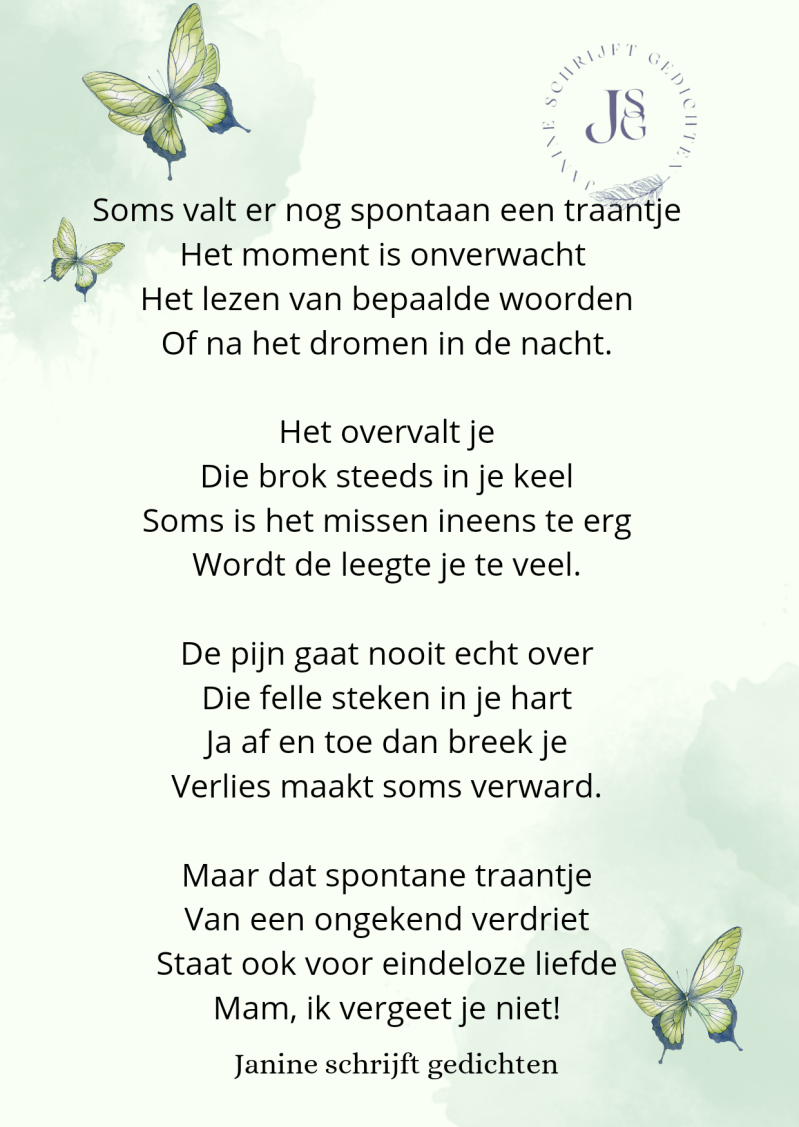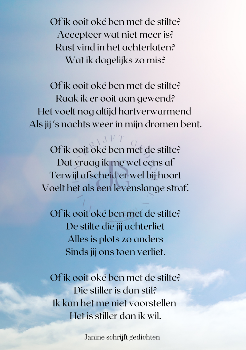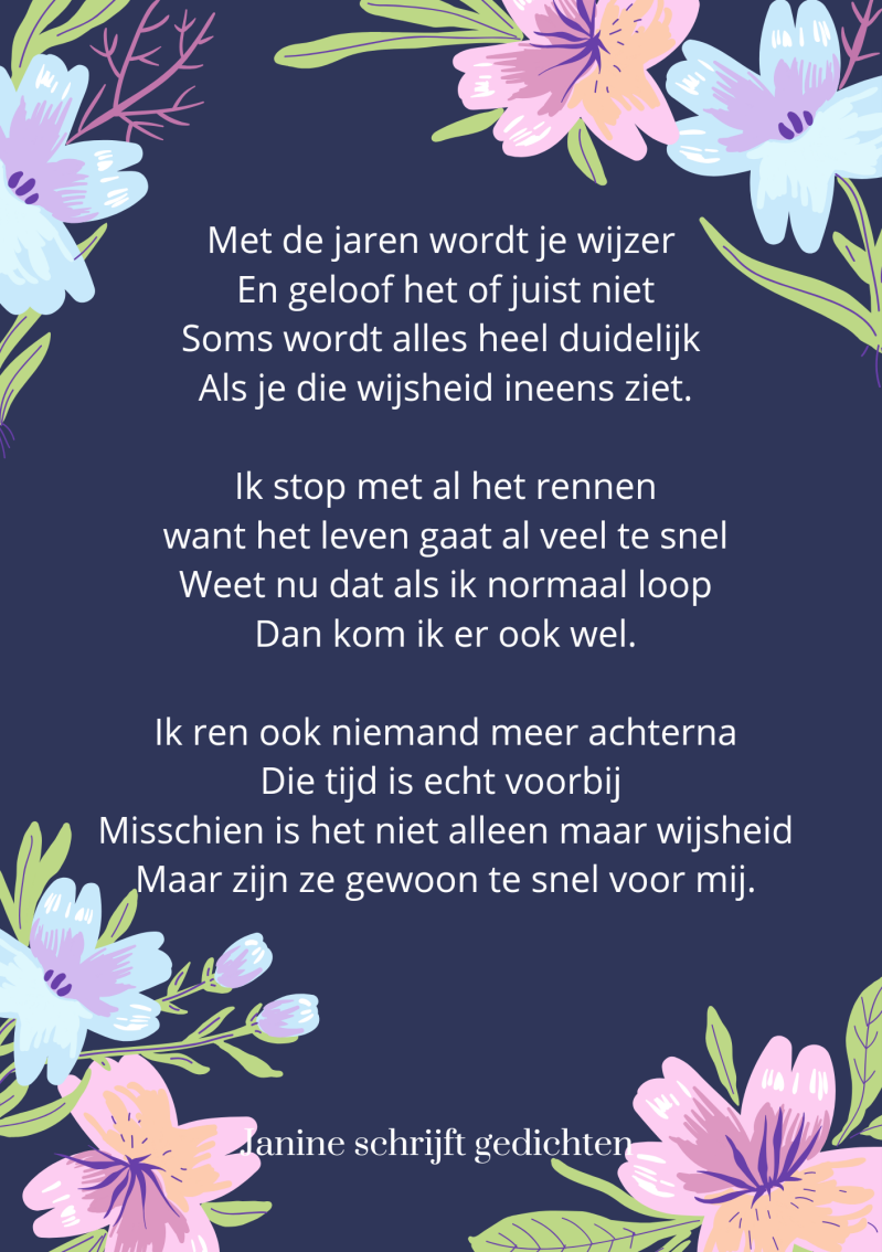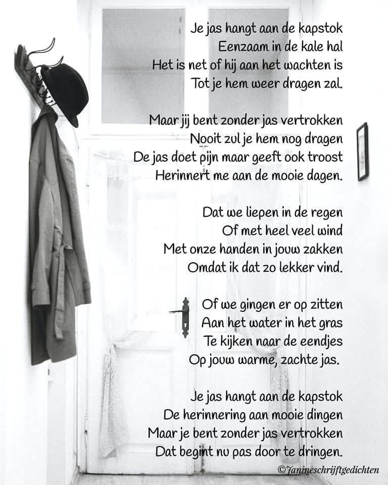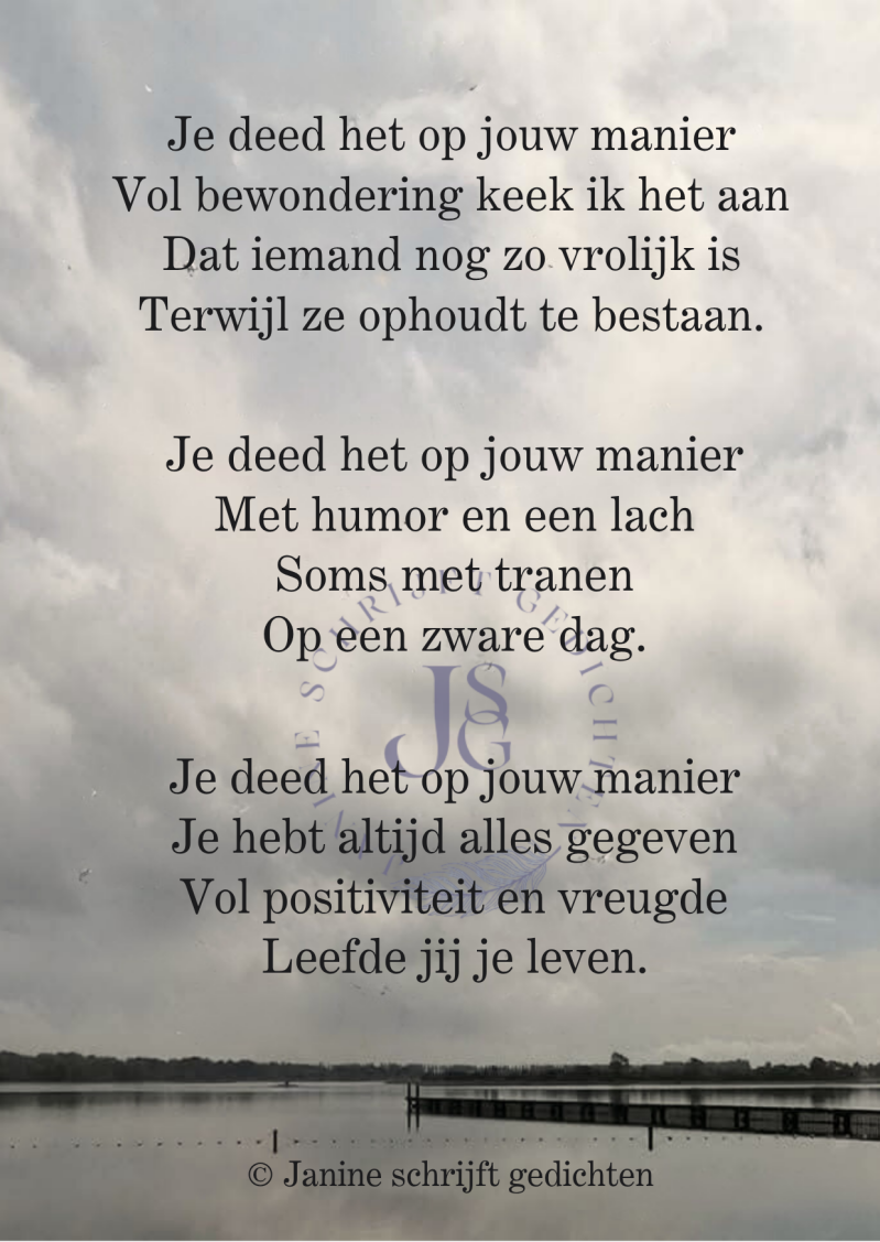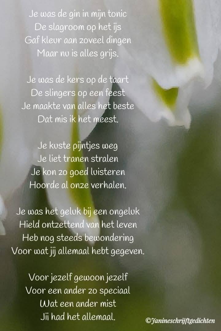 Bijna al mijn gedichten deel ik via mijn facebookpagina @janineschrijftgedichten. Niet iedereen heeft Facebook, maar soms wil je misschien wel een gedicht lezen. Daarom wil ik nu af en toe een gedicht in een blog zetten. Zo is het voor iedereen met internet mogelijk om de gedichten te lezen. Ik heb geen idee of hier vraag naar is of dat het gewaardeerd wordt. Dus laat gerust een reactie achter, dan weet ik of ik het moet blijven doen of niet. Alvast heel vriendelijk bedankt.