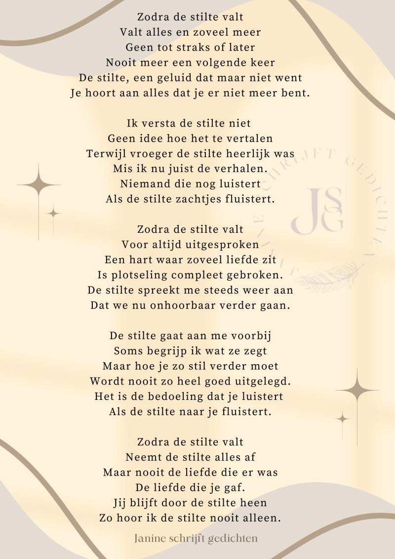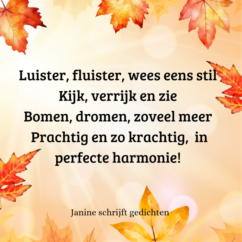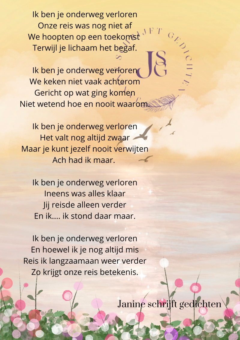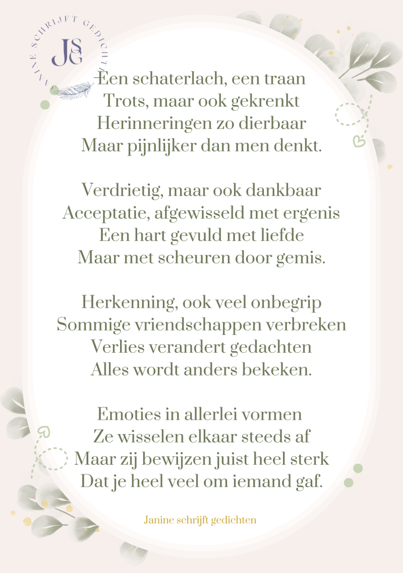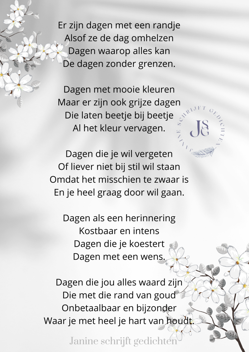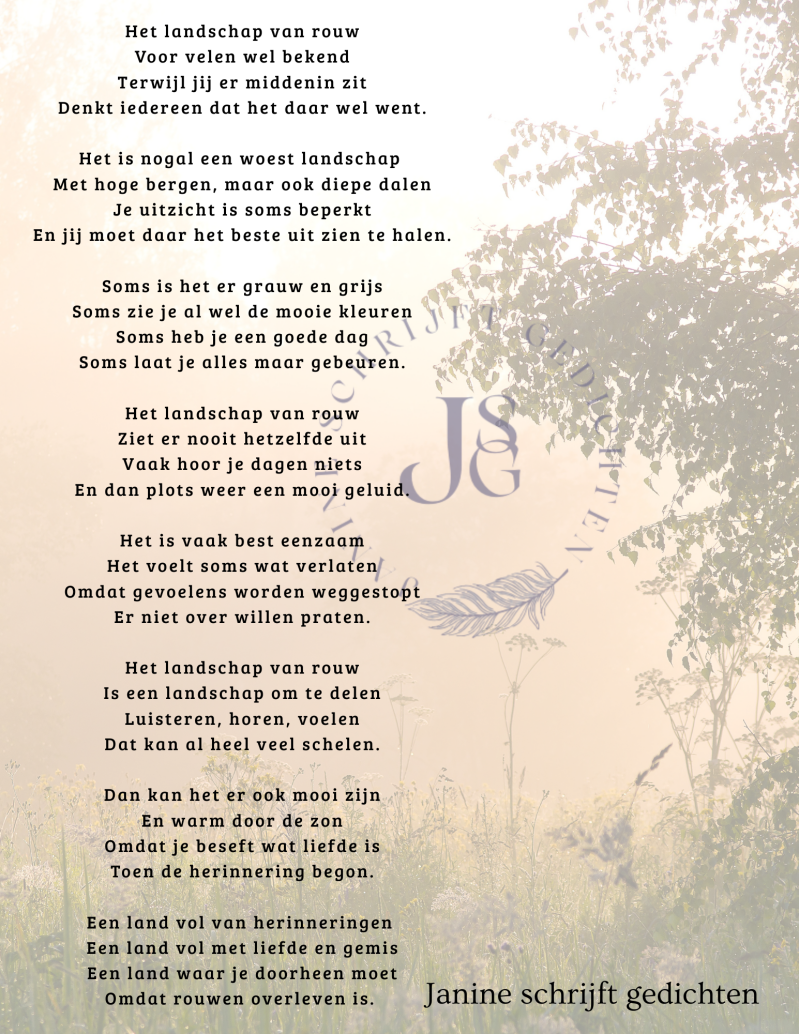 Bijna al mijn gedichten deel ik via mijn facebookpagina @janineschrijftgedichten. Niet iedereen heeft Facebook, maar soms wil je misschien wel een gedicht lezen. Daarom wil ik nu af en toe een gedicht in een blog zetten. Zo is het voor iedereen met internet mogelijk om de gedichten te lezen. Ik heb geen idee of hier vraag naar is of dat het gewaardeerd wordt. Dus laat gerust een reactie achter, dan weet ik of ik het moet blijven doen of niet. Alvast heel vriendelijk bedankt.