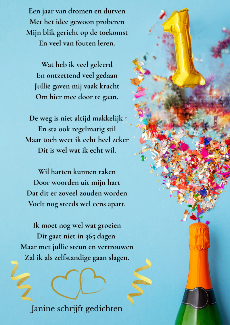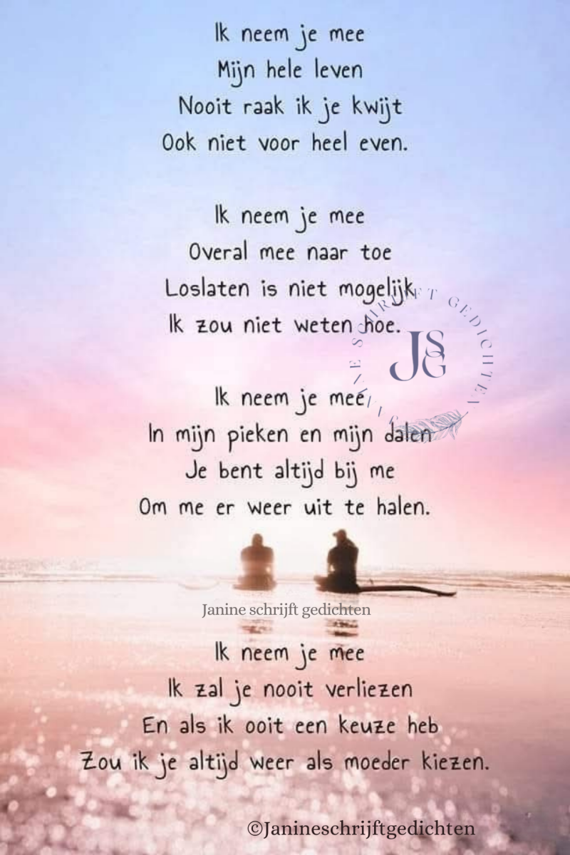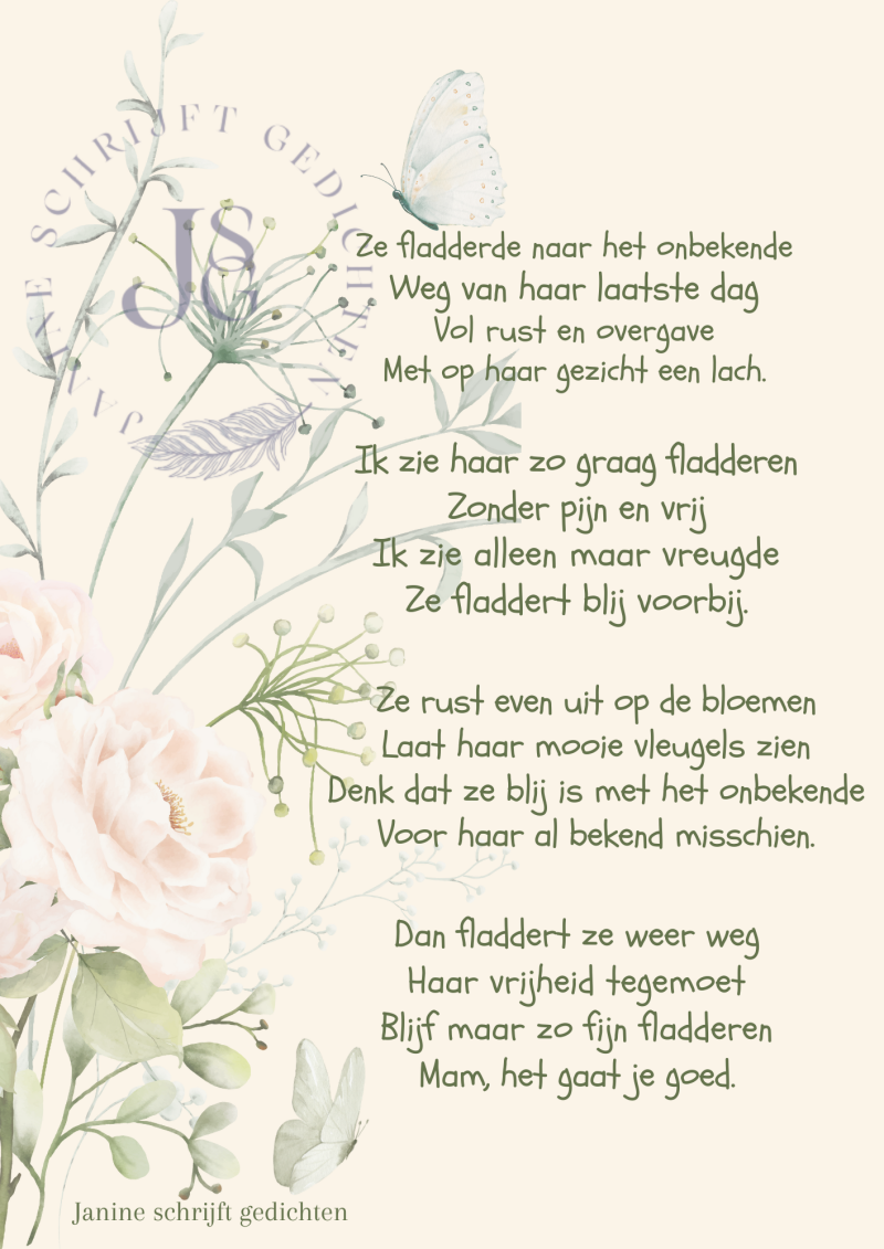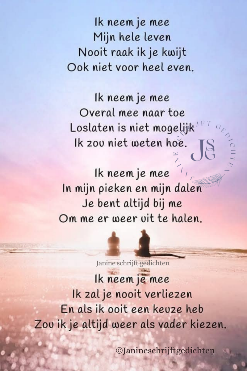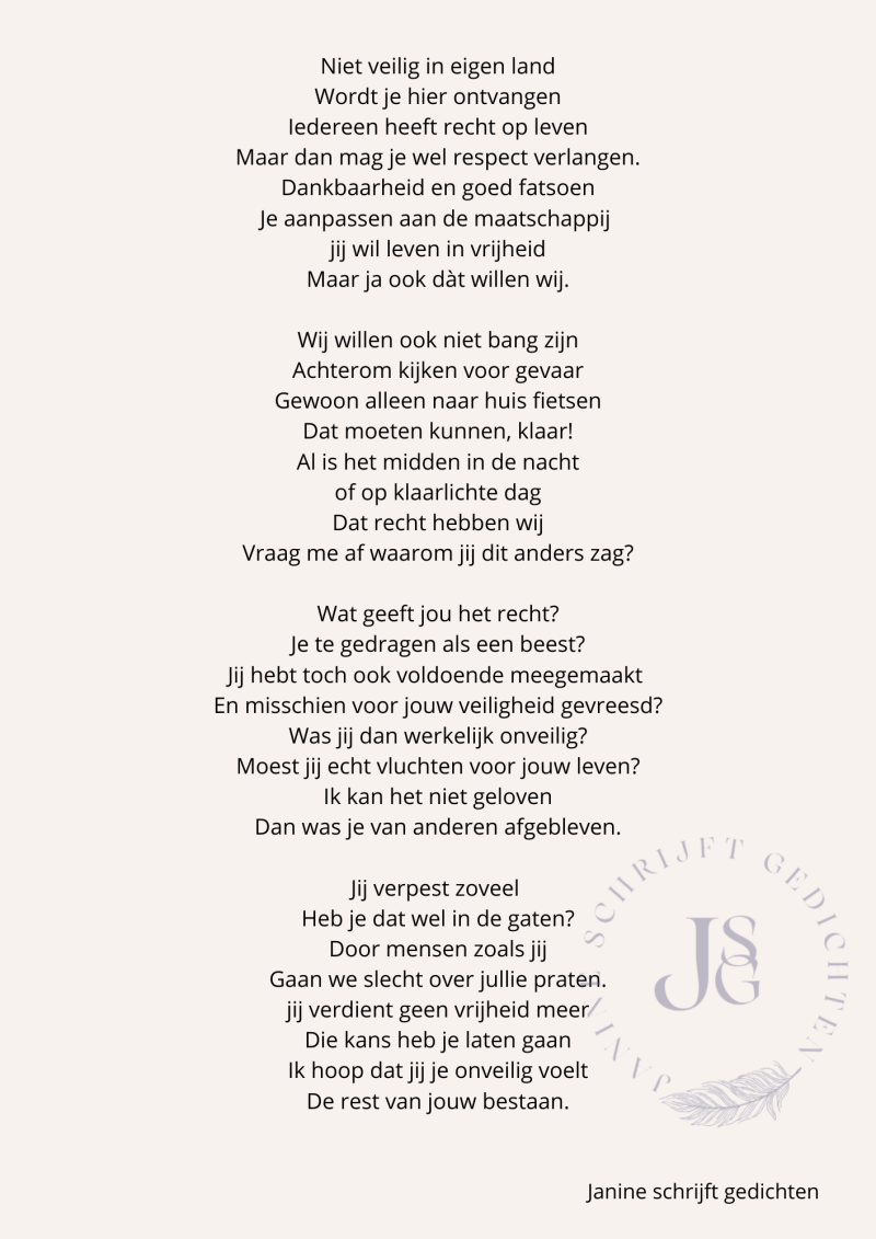 Bijna al mijn gedichten deel ik via mijn facebookpagina @janineschrijftgedichten. Niet iedereen heeft Facebook, maar soms wil je misschien wel een gedicht lezen. Daarom wil ik nu af en toe een gedicht in een blog zetten. Zo is het voor iedereen met internet mogelijk om de gedichten te lezen. Ik heb geen idee of hier vraag naar is of dat het gewaardeerd wordt. Dus laat gerust een reactie achter, dan weet ik of ik het moet blijven doen of niet. Alvast heel vriendelijk bedankt.