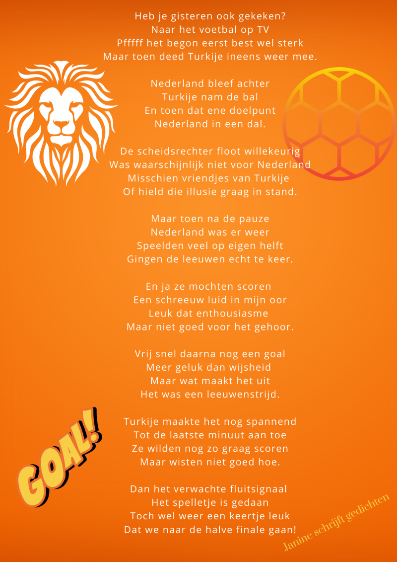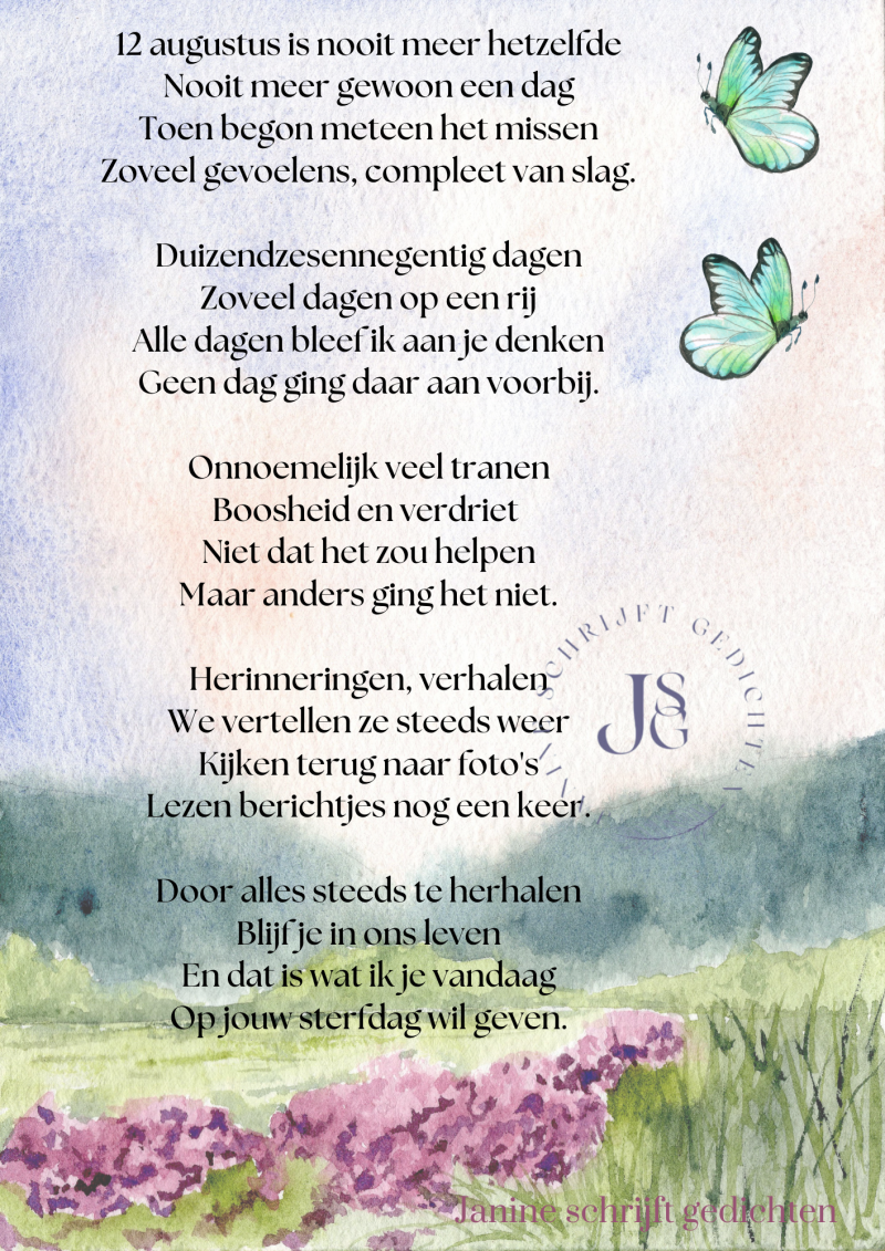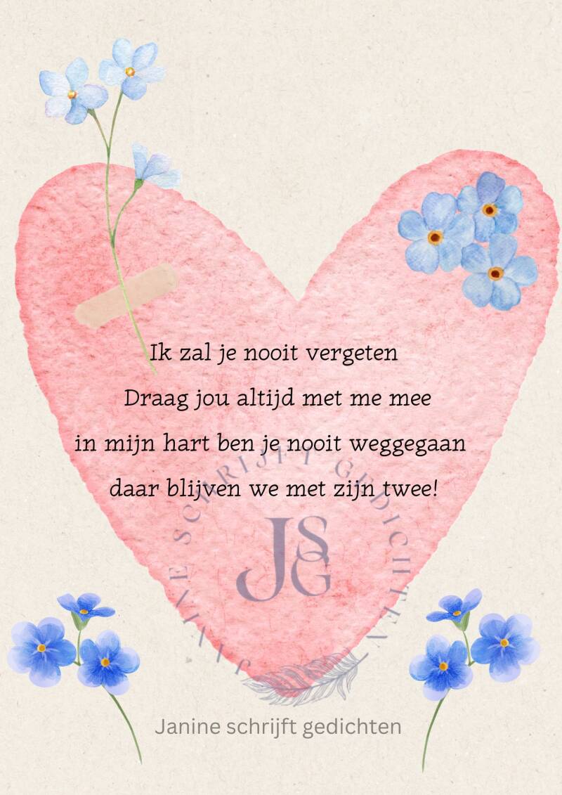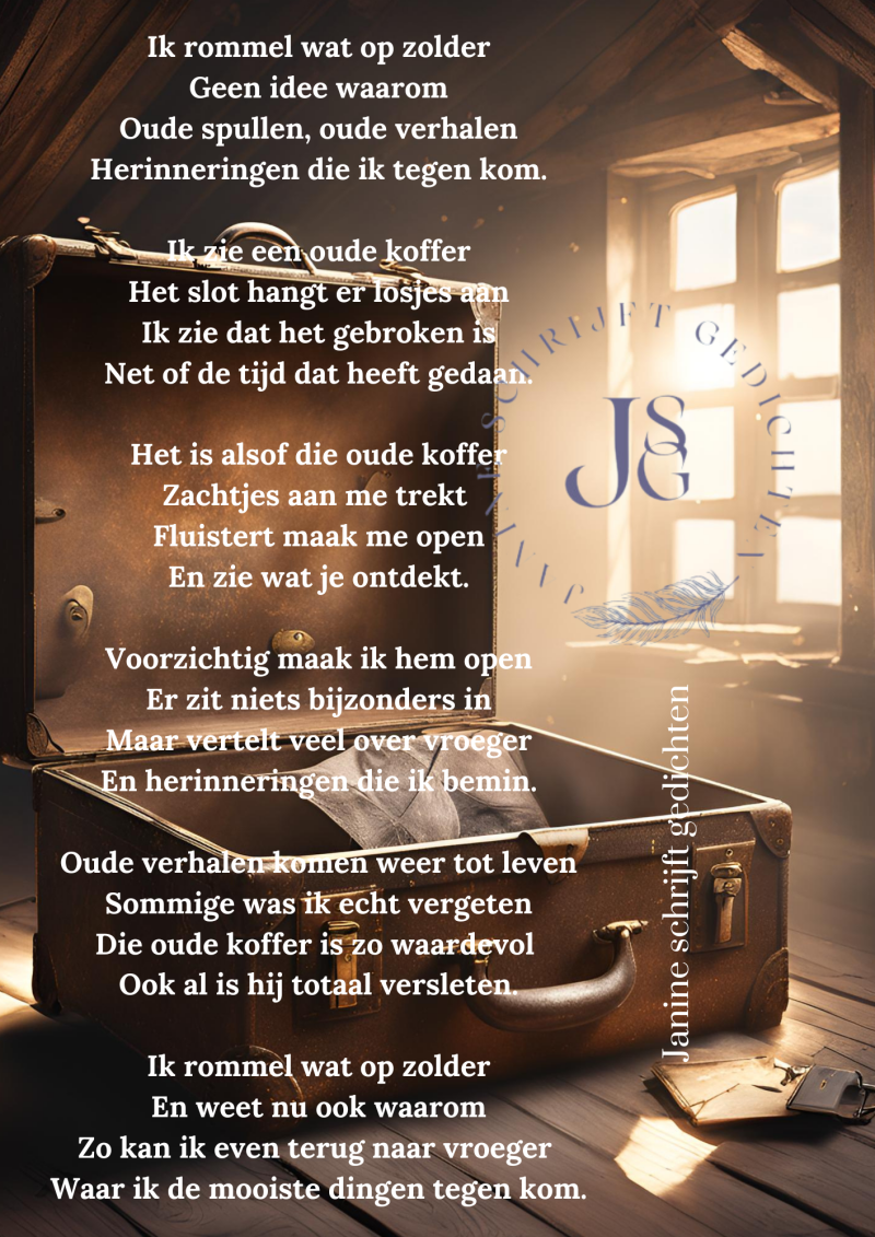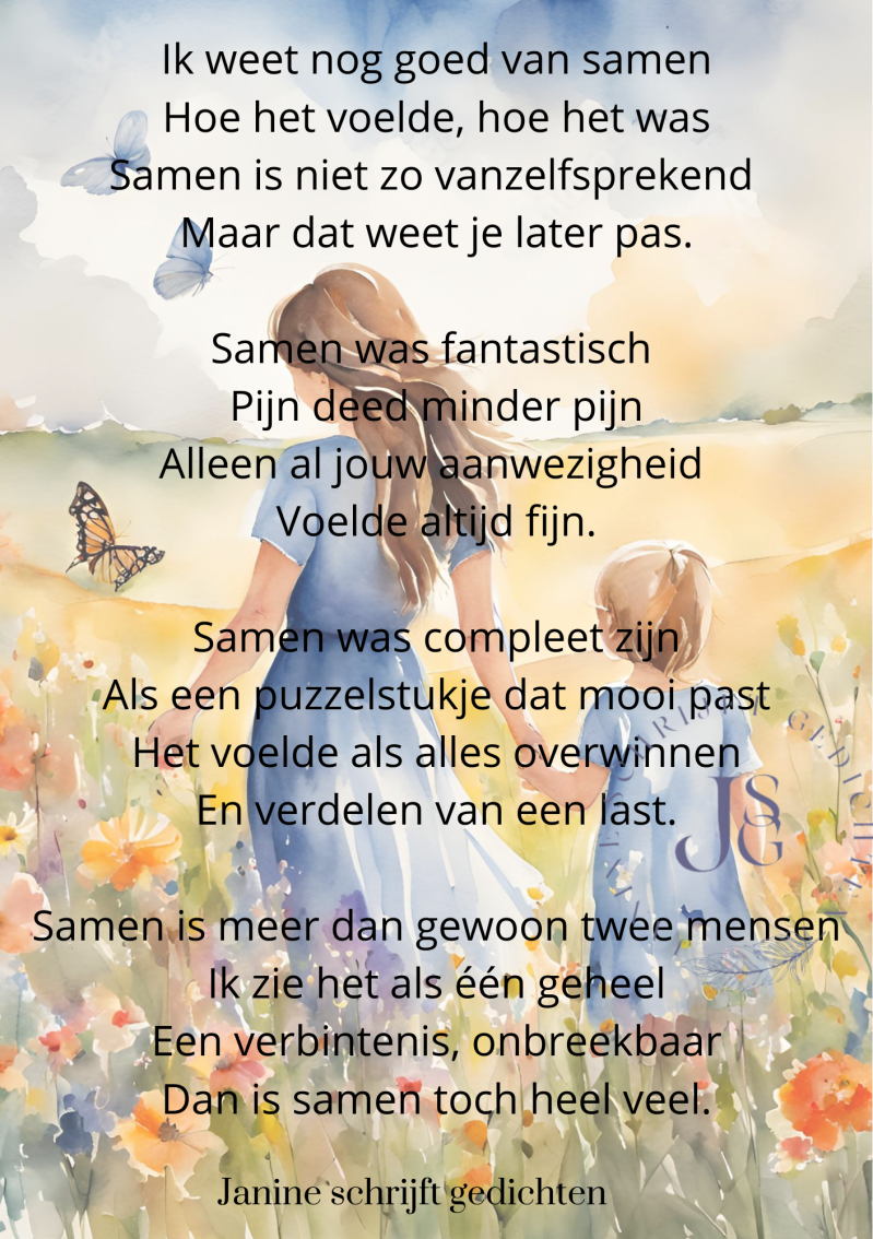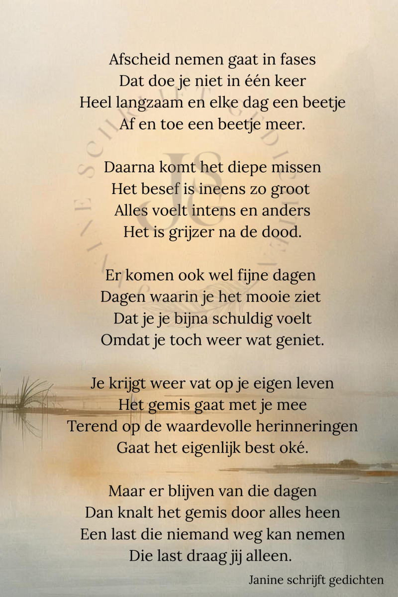Bijna al mijn gedichten deel ik via mijn facebookpagina @janineschrijftgedichten. Niet iedereen heeft Facebook, maar soms wil je misschien wel een gedicht lezen. Daarom wil ik nu af en toe een gedicht in een blog zetten. Zo is het voor iedereen met internet mogelijk om de gedichten te lezen. Ik heb geen idee of hier vraag naar is of dat het gewaardeerd wordt. Dus laat gerust een reactie achter, dan weet ik of ik het moet blijven doen of niet. Alvast heel vriendelijk bedankt.
