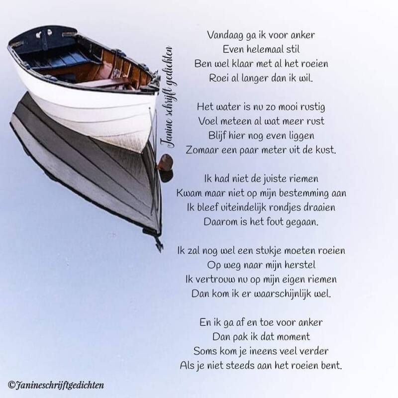 Dit gedicht schreef ik een jaar geleden. Het is een heel belangrijk gedicht voor me geworden. De knop ging om, ik stopte met roeien en ik kwam inderdaad een heel stuk verder dan toen ik heel hard roeide. Even stil, even naar jezelf, zo moeilijk, maar wel heel erg belangrijk.