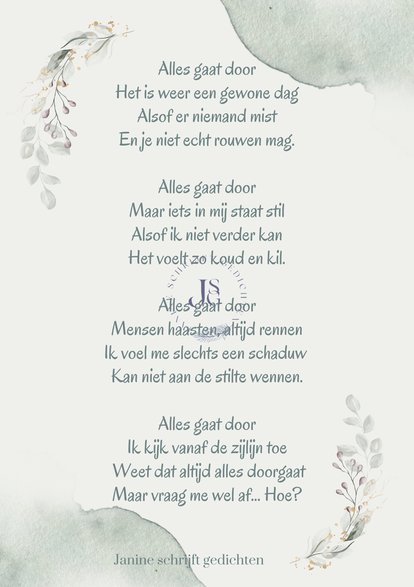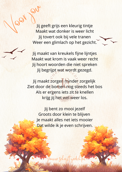 Gedicht A5 formaat, afgedrukt op 300 grams wit papier. Kan verstuurd worden, maar ook mooi om in te lijsten. Achterkant kan beschreven worden.